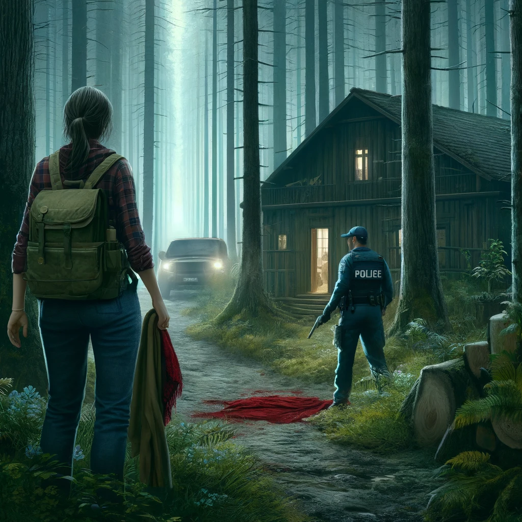 In einem dichten Wald befindet sich eine verlassene Jagdhütte, teilweise verborgen von Bäumen. Der Himmel ist leicht bewölkt, was eine unheimliche Atmosphäre schafft. Im Vordergrund untersuchen eine Frau in Wanderkleidung und ein Polizist einen blutbefleckten Schal. Die Tür der Hütte steht einen Spalt offen, was eine Spannung und ein Gefühl von Geheimnis in der Luft verstärkt.